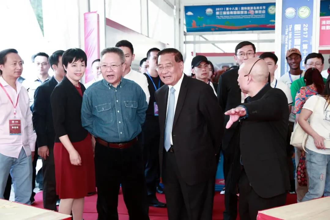 2017年海南國際旅游美食博覽會上時任海南省委副書記、省長沈曉明(左二)、中國烹飪協(xié)會副會長李亞光(右二)、時任海南省旅游和文化廣電體育廳副廳長周平(后排右二)等省廳領導巡視博覽會,由海南省旅游餐飲協(xié)會常務副會長兼秘書長唐潔春(右一)陪同介紹