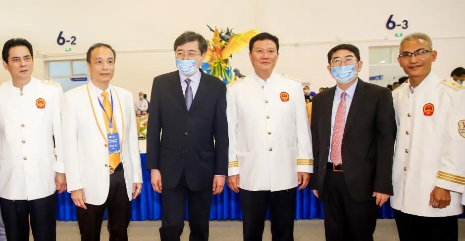 中華人民共和國文化和旅游部黨組成員、副部長張旭(左三)、海南省人民政府副省長王路(右二)等領導嘉賓與烹飪大師合影留念。